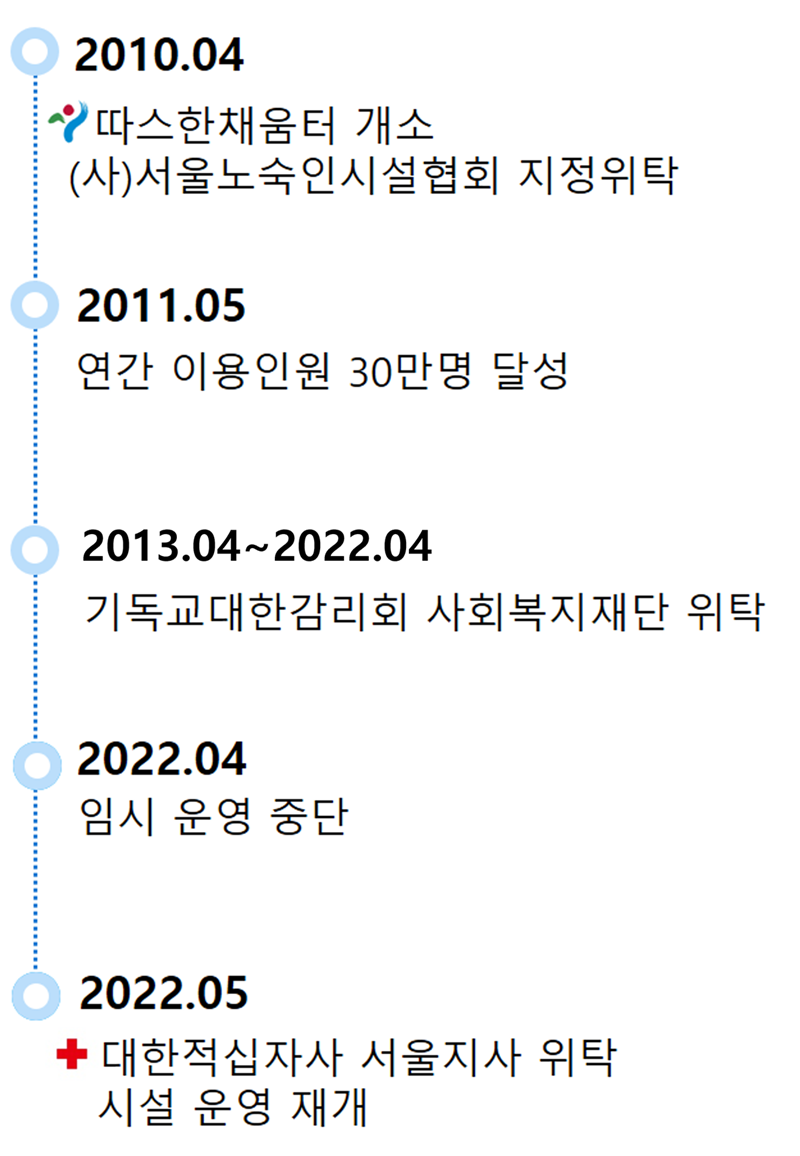 상호 : 서울특별시립 따스한채움터  /  등록번호 : 309-82-68989  /  대표 : 김관우  /  서울특별시 용산구 한강대로 377 (동자동, 무료급식시설)