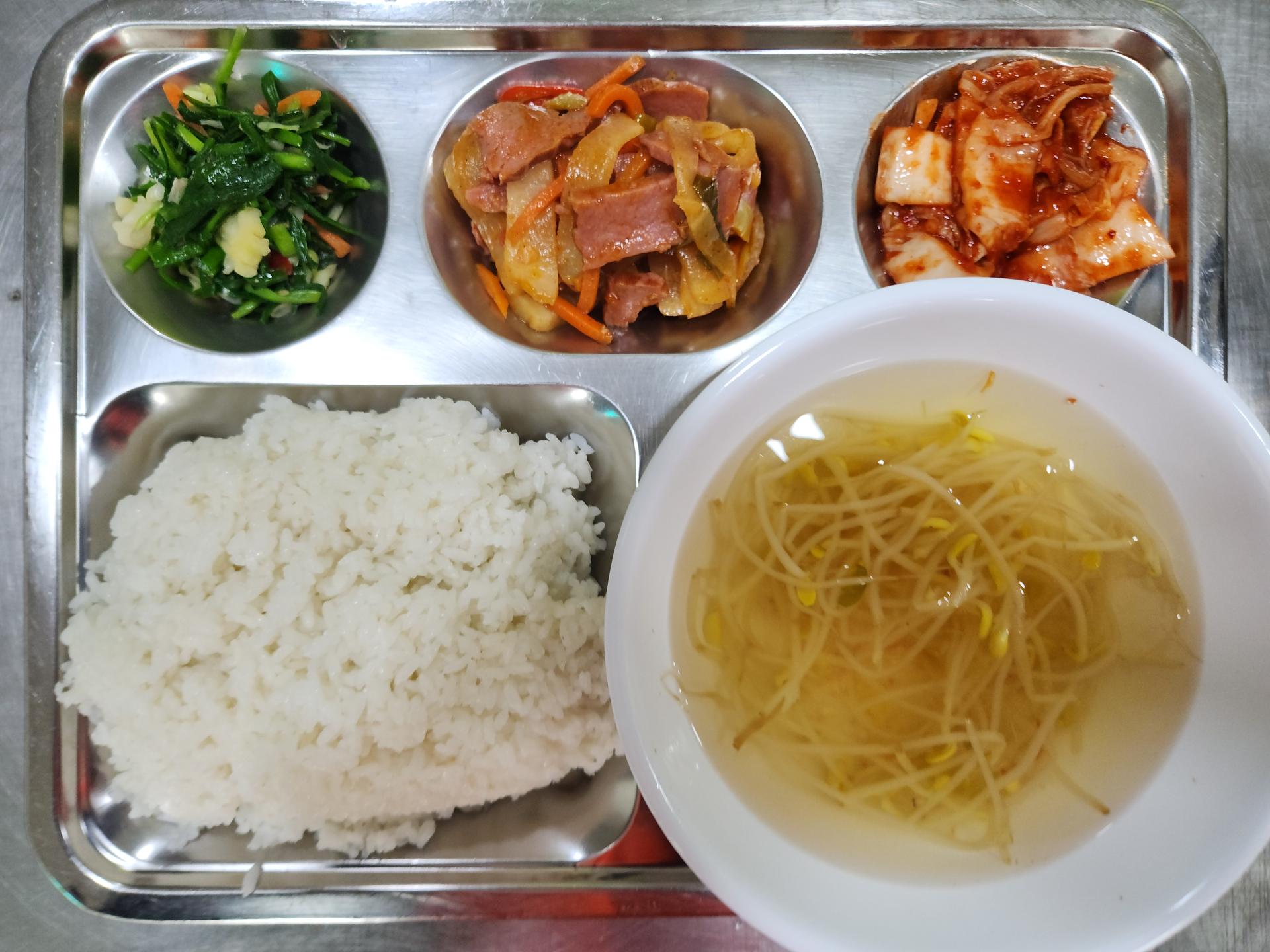 2025년05월21일(중식) : 쌀밥, 콩나물국, 김치, 부추나물볶음, 햄야채볶음