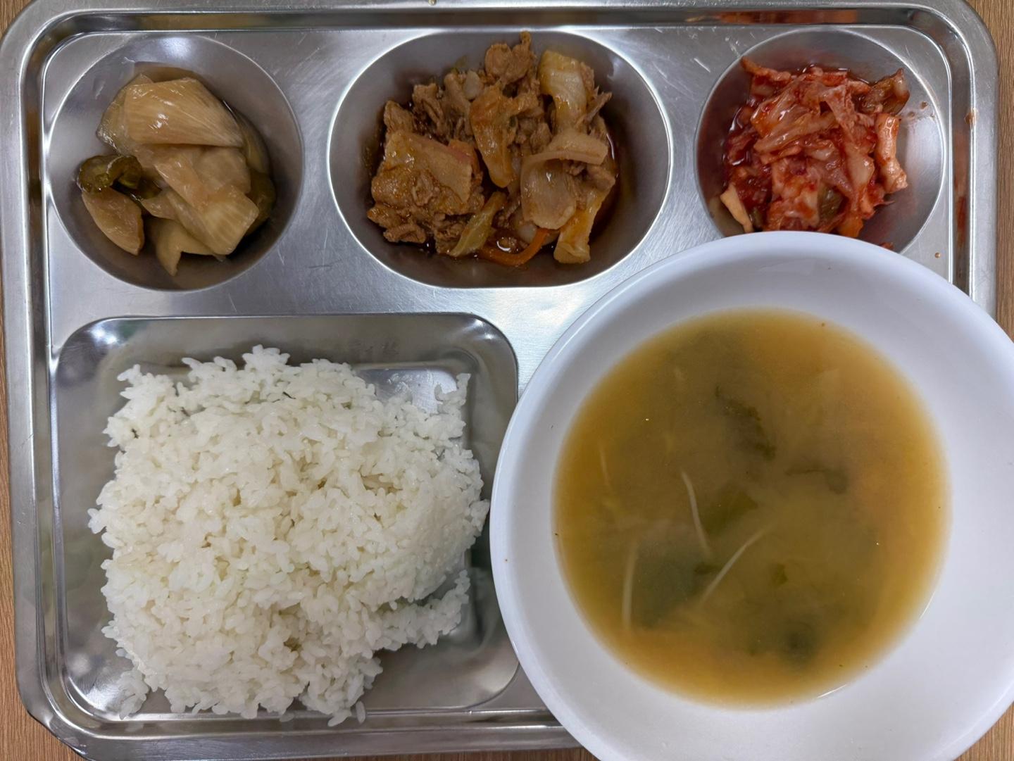 2025년07월18일(석식) : 쌀밥,열무콩나물된장국,돈육고추장불고기,양파초간장절임,김치