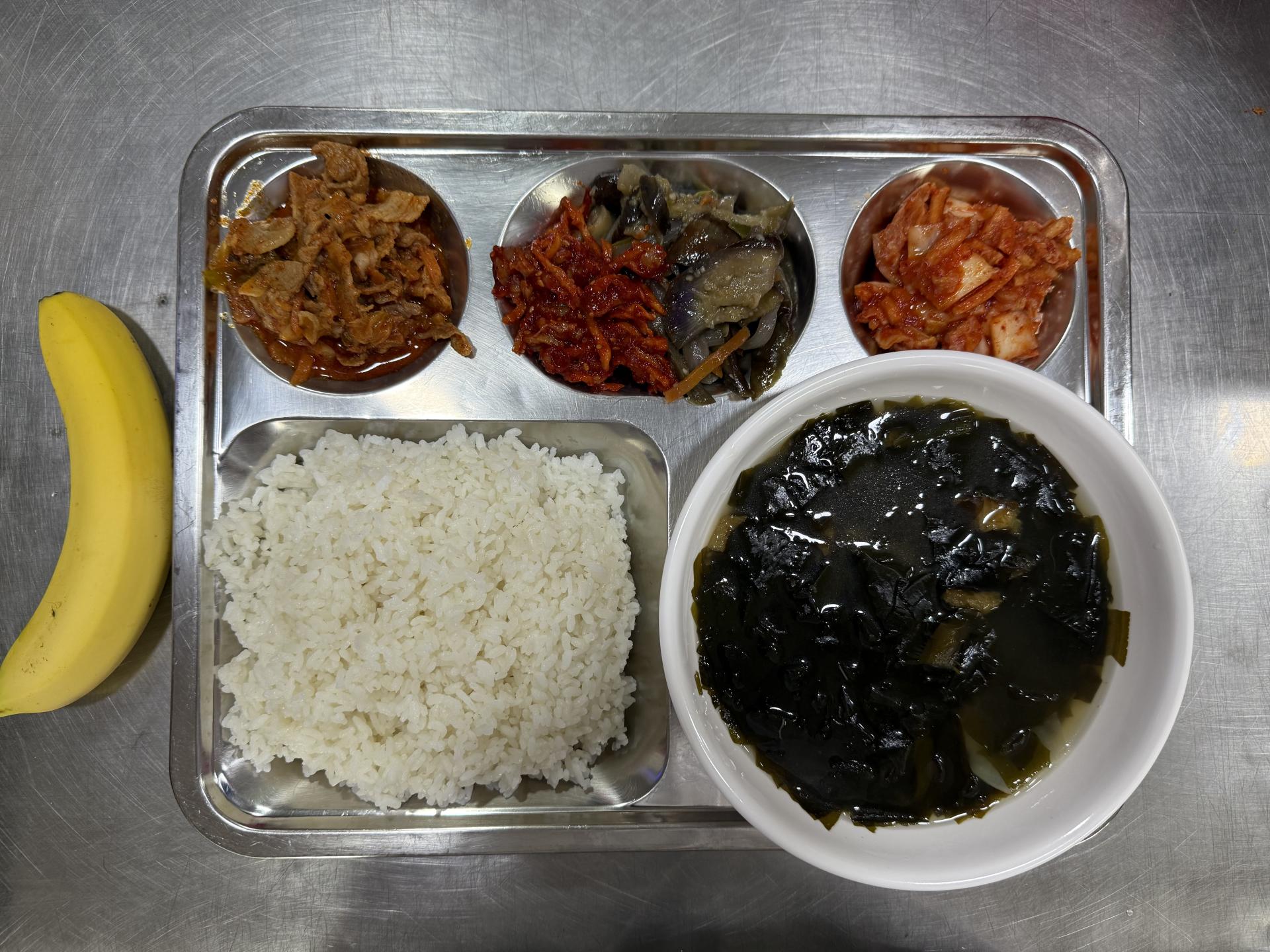 2025년10월01일(석식) : 쌀밥,황태미역국,돈육고추장불고기,가지볶음,오징어젓무침,김치,바나나
