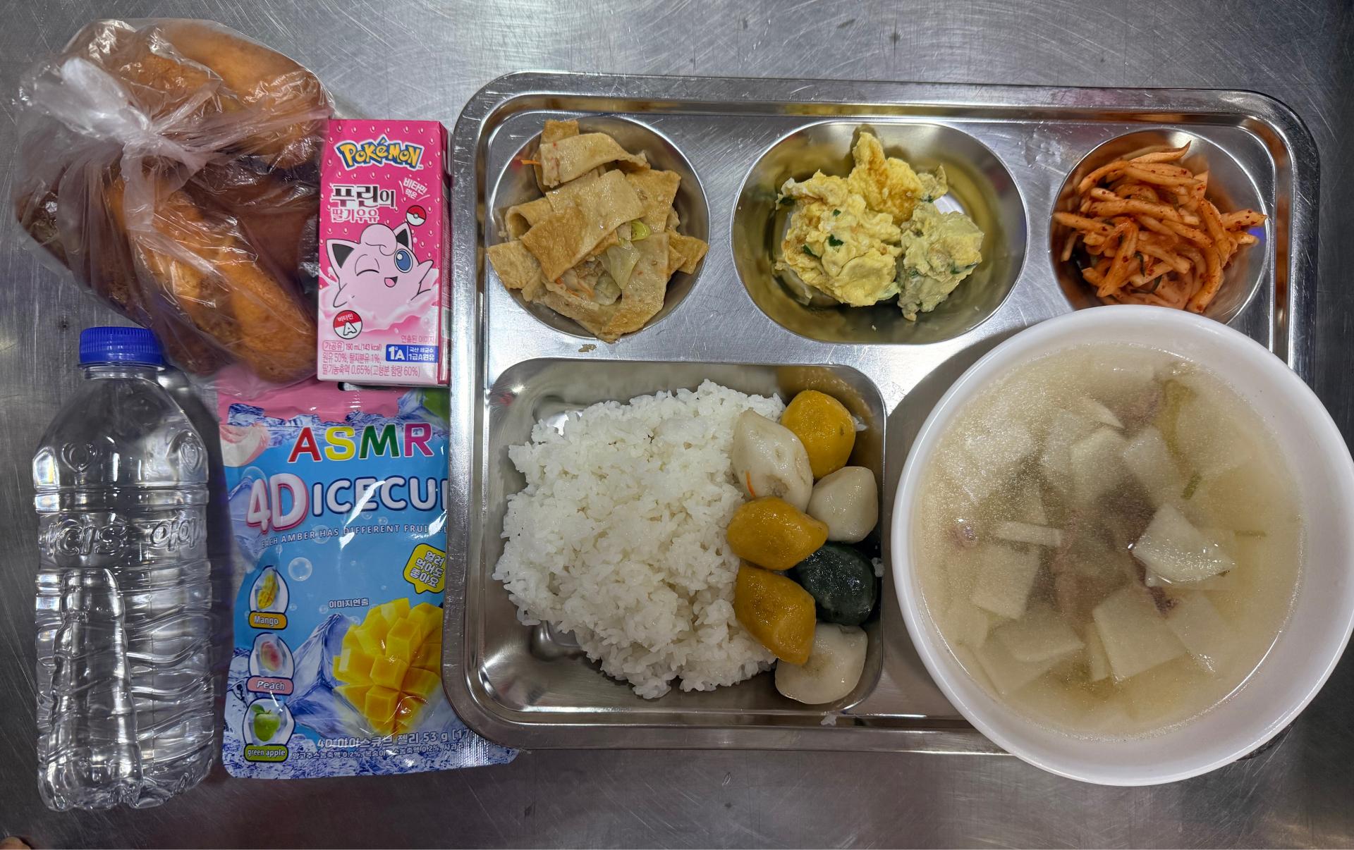 2025년10월10일(중식) : 쌀밥,소고기무국,계란찜,사각어묵볶음,무생채,송편,파운드케익,우유,젤리,생수