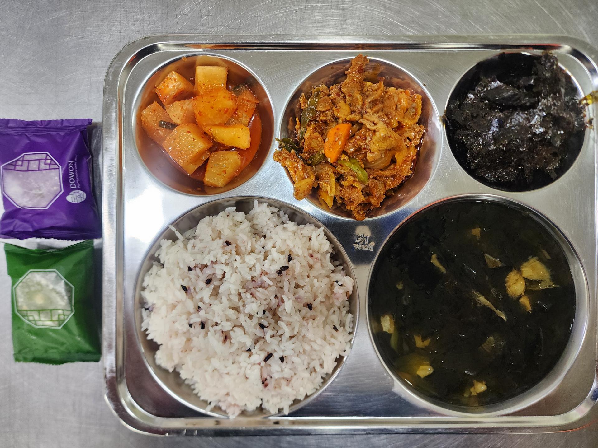 2025년09월18일(석식) : 흑미밥,황태미역국,돈육고추장불고기,조미김가루,깍두기,떡