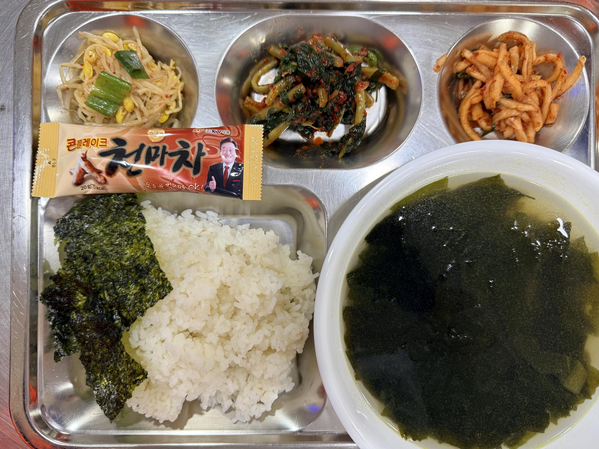 2025년10월13일(중식) : 쌀밥,소고기미역국,콩나물무침,무생채,열무겉절이,조미김,천마차