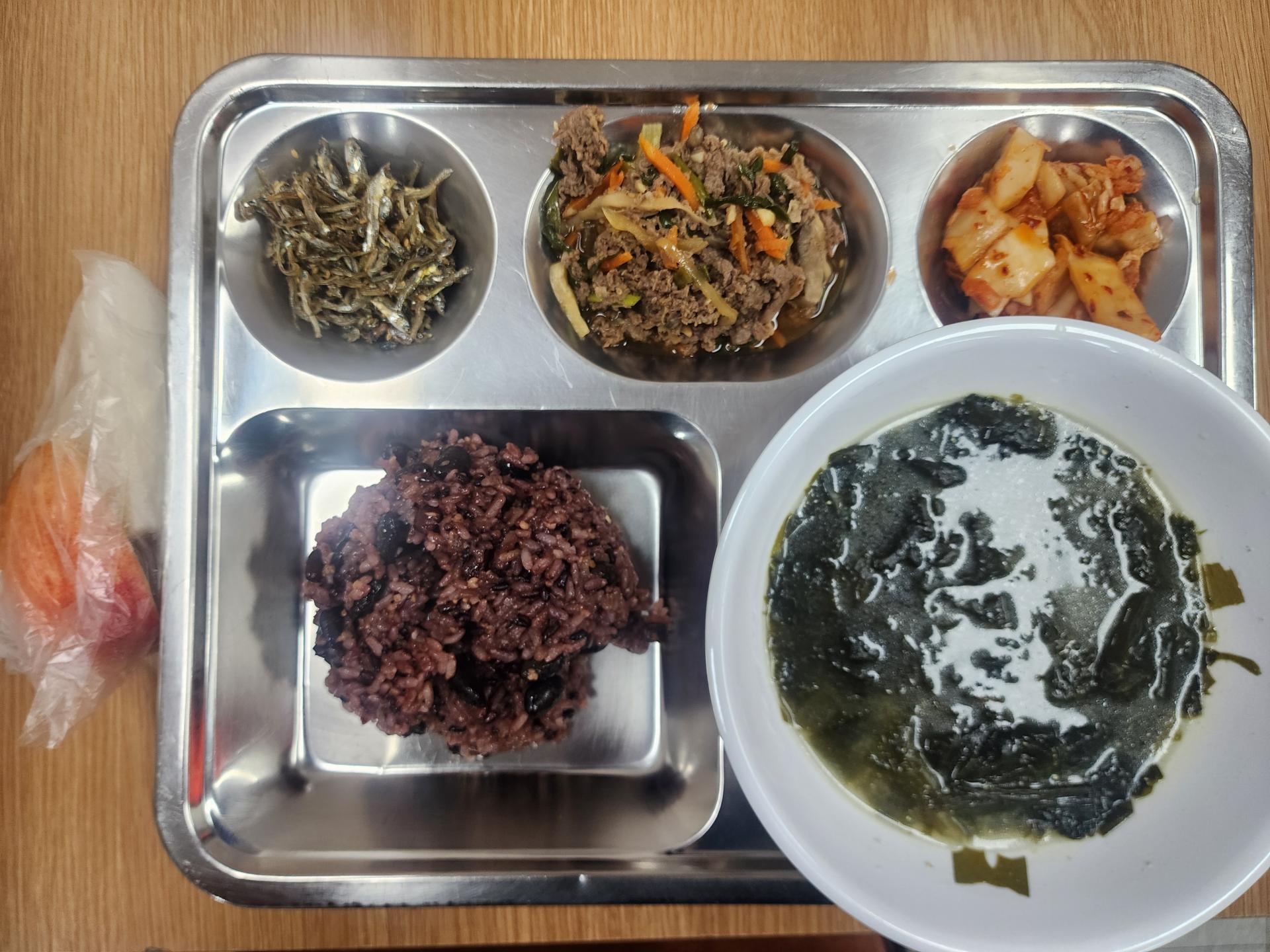 2025년09월28일(석식) : 찰밥,미역국,소불고기,멸치볶음,김치,과일2종