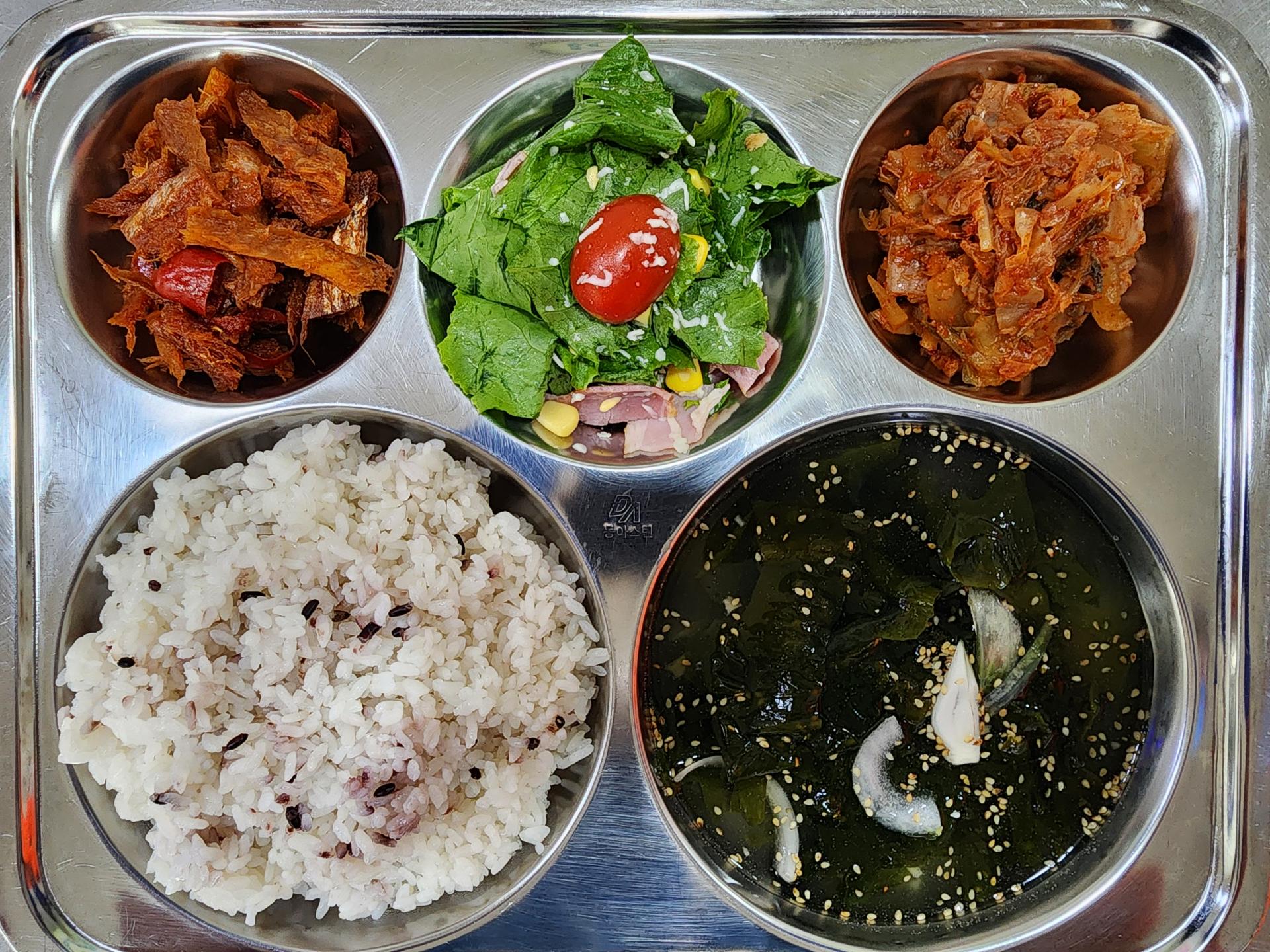 2025년07월03일(석식) : 흑미밥,미역냉국,황태채고추장무침,눈꽃치즈베이컨시저샐러드,김치