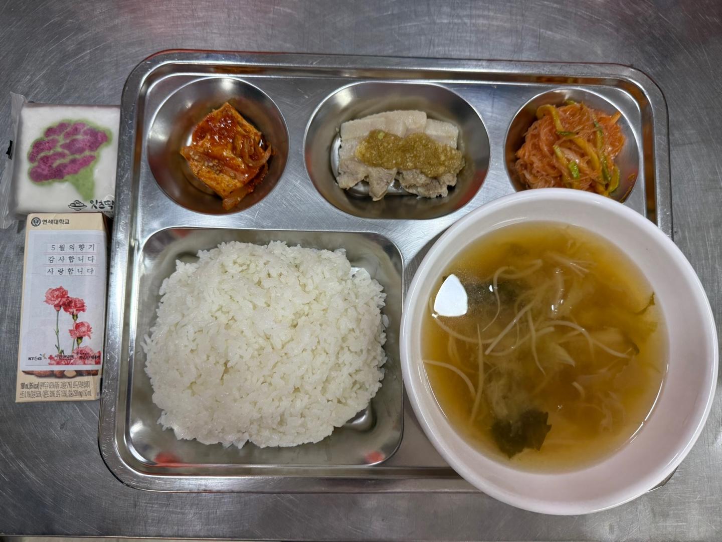 2025년05월13일(중식) : 쌀밥, 우거지된장국,돈삼겹&마늘소스, 두부고추장조림,실곤약야채무침,떡,두유
