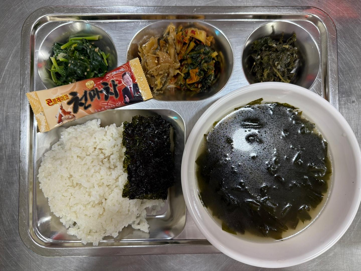 2025년06월09일(중식) : 쌀밥,들깨미역국, 묵은지볶음,시금치나물,고추잎나물,얼갈이겉절이,조미김,천마차