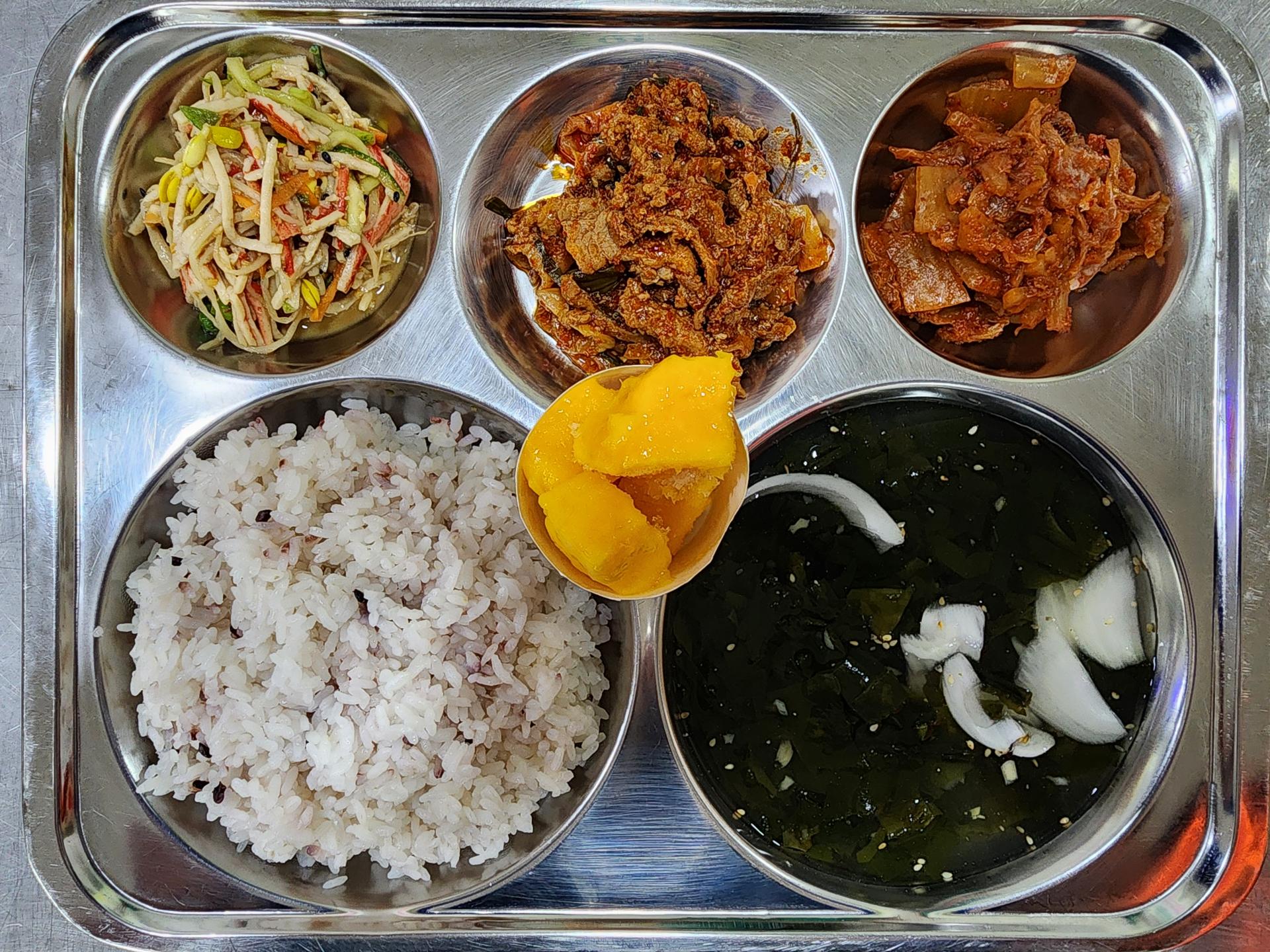 2025년07월10일(석식) : 흑미밥,미역냉국,돈육고추장불고기,콩나물게맛살겨자냉채,볶음김치,아이스망고