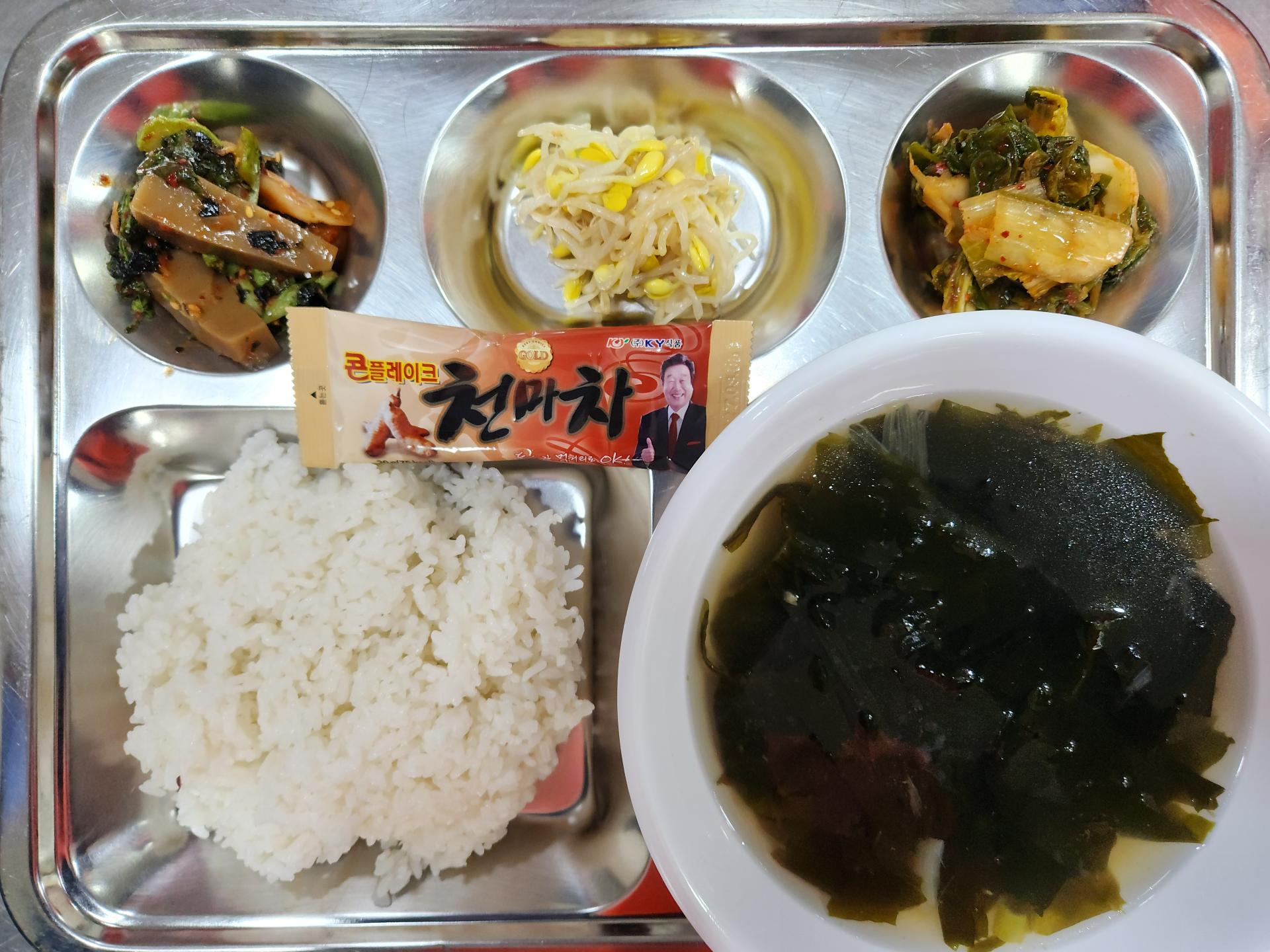 2025년05월26일(중식) : 쌀밥,소고기미역국,도토리묵무침,콩나물무침,얼갈이김치,천마차