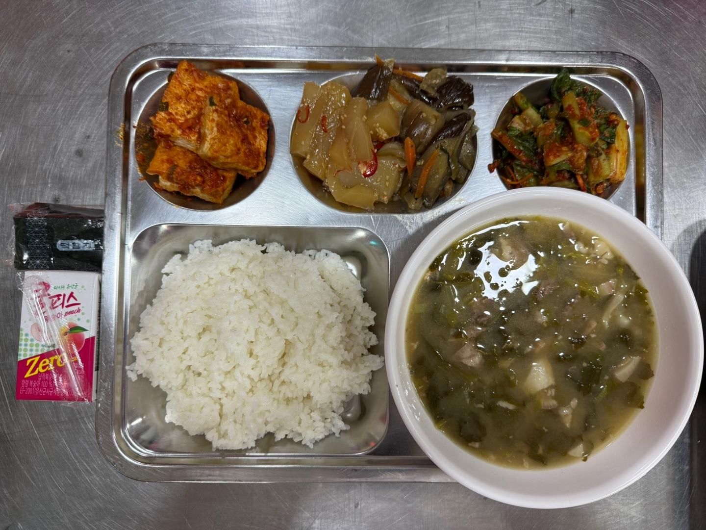 2025년05월28일(석식) : 쌀밥,돈육우거지된장국,두부양념조림,가지볶음,청포묵무침,상추겉절이,유산균음료,떡